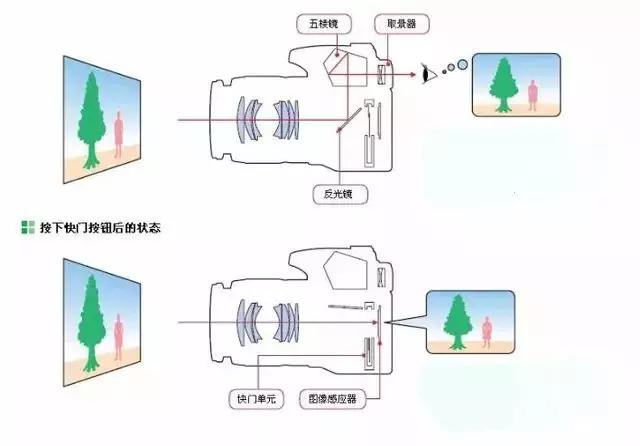 那時(shí)候區(qū)別單電相機(jī)與單反相機(jī),就在于在原本是反光板的地方采用了固定式的半透鏡。當(dāng)光線從鏡頭進(jìn)入后,有一部分被反射到機(jī)頂,給測光和對焦系統(tǒng)使用;另一部分則透過反光鏡射到圖像傳感器上,用來取景、成像。