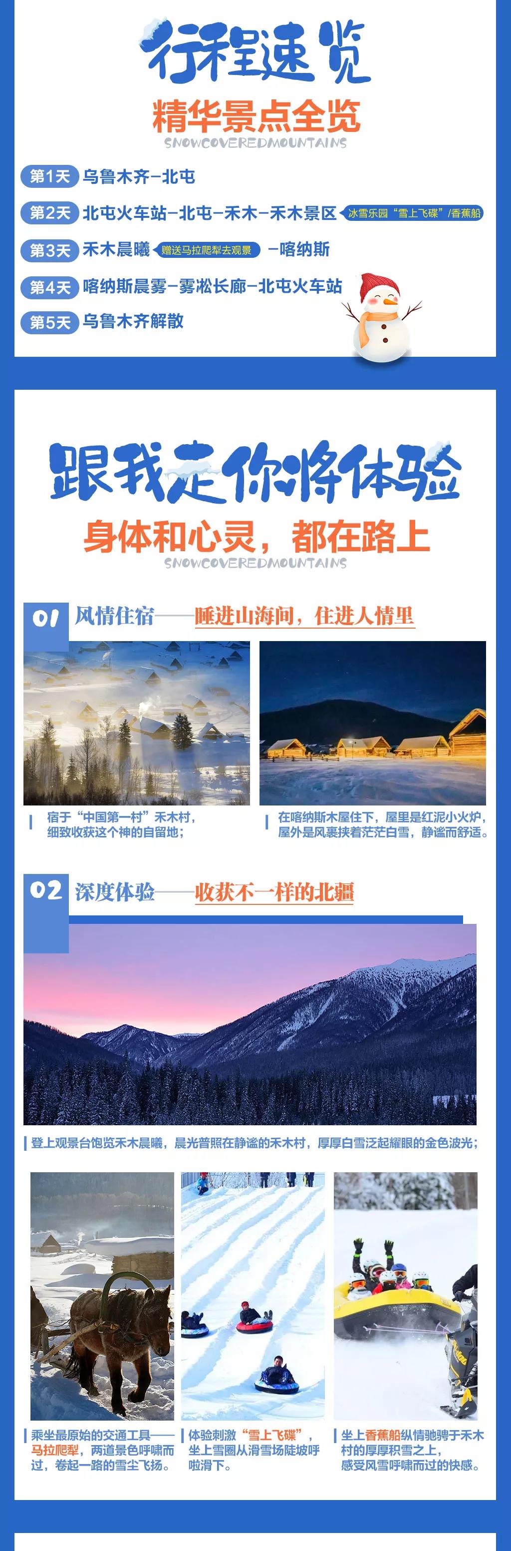 4. 贈送禾木村冰雪樂園中的滑雪或香薰船體驗,如游客想?yún)⒓悠渌鼕蕵讽椖抠M用敬請自理。