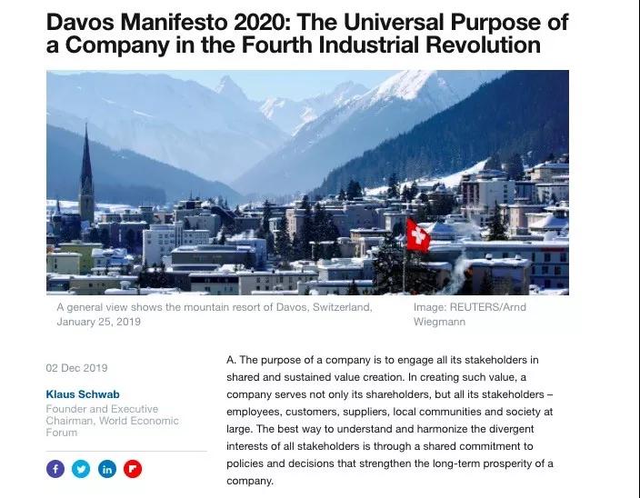 “這是世界經(jīng)濟(jì)論壇50年前成立的初衷,”施瓦布堅(jiān)信,“也是我們?cè)谖磥?0年努力的方向?!?大公司已開始重新思考自己的價(jià)值。