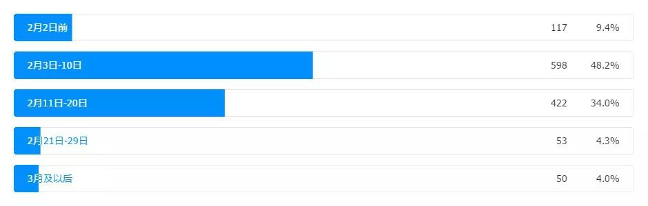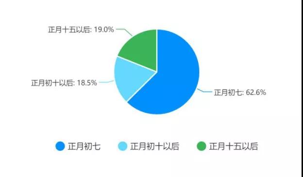 根據(jù)統(tǒng)計(jì)結(jié)果來(lái)看,62.6%的企業(yè)在疫情未大范圍傳播時(shí)的開(kāi)工時(shí)間為正月初七(國(guó)家法定假日結(jié)束),18.5%的企業(yè)開(kāi)工時(shí)間為正月初十后,19%的企業(yè)開(kāi)工時(shí)間為正月十五后,基本上符合春節(jié)假期的主流放假時(shí)間。
