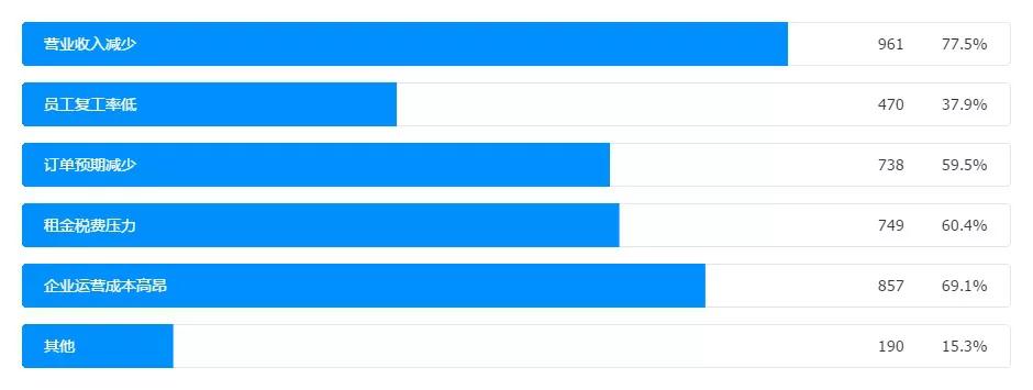 結(jié)合上述第6個(gè)問(wèn)題數(shù)據(jù),分析可以看出,當(dāng)前受疫情影響員工復(fù)工率低,導(dǎo)致企業(yè)既不能進(jìn)行正常的復(fù)工,還要承擔(dān)員工的工資及五險(xiǎn)一金開(kāi)支,直接造成了入不敷出的困難情況。