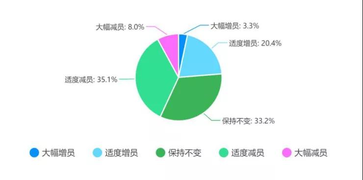 現(xiàn)有數(shù)據(jù)可以看出,當(dāng)前企業(yè)對(duì)于企業(yè)發(fā)展的態(tài)勢(shì)都持觀望態(tài)度,導(dǎo)致企業(yè)在用工方面體現(xiàn)出比較保守的選擇:超過(guò)33%的企業(yè)將會(huì)保持本企業(yè)的用工情況,不進(jìn)行進(jìn)一步的擴(kuò)張,而超過(guò)35%的企業(yè)將會(huì)通過(guò)適度裁員的情況來(lái)緩解當(dāng)前企業(yè)的困境。值得注意的是,有8%的企業(yè)表示將會(huì)以大幅裁員緩解企業(yè)困境,可見(jiàn)企業(yè)對(duì)于本次疫情對(duì)于經(jīng)濟(jì)的負(fù)面影響普遍比較擔(dān)心。