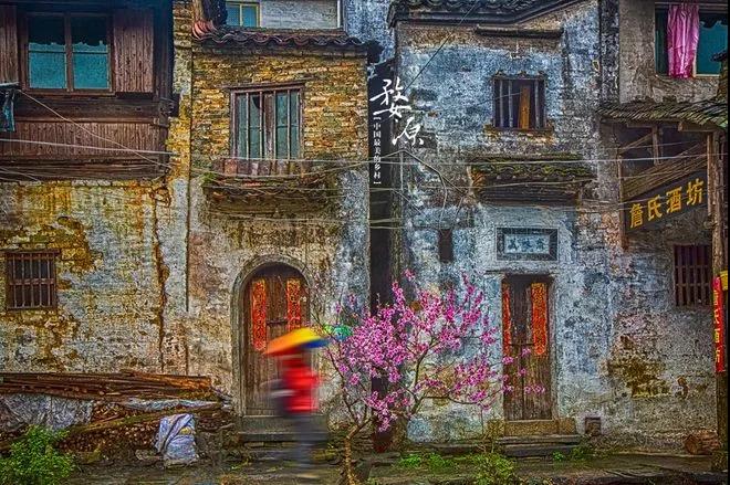 這張照片是在慶源村拍攝的。在這個古城兩旁是古建筑,中間是有一條小溪的,這個村落相對李村,李坑來說我認為他更加原生態(tài)。這次婺源自由拍攝,對這個村印象最深刻的是因為兩旁桃花盛開,梨花也盛開,剛好下了雨,如果說你讀過雨巷,此時,走在這條古村,撐著雨傘,真的是走入了畫境里面了。所以還想去一次去這個地方,因為還有很多角度,有待慢慢挖掘。