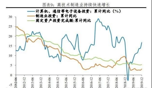 但高技術(shù)制造業(yè)投資快速增長,產(chǎn)業(yè)結(jié)構(gòu)持續(xù)優(yōu)化,短板領(lǐng)域投資加強。2019年高技術(shù)制造業(yè)同比17.7%,較2018年提高1.6個百分點,占制造業(yè)投資比重超過20%。道路運輸業(yè)、生態(tài)保護和環(huán)境治理業(yè)以及信息服務(wù)業(yè)投資等短板領(lǐng)域投資得到加強,投資同比分別為9.0%、37.2%和17.4%。