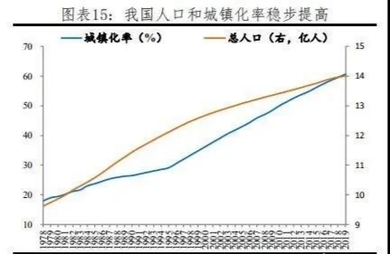 2019年城鎮(zhèn)化率達60.60%,比上年末提高1.02個百分點,保持穩(wěn)步增長態(tài)勢,較高收入經(jīng)濟體的81.3%仍有20個百分點的空間。過去四十年,中國城鎮(zhèn)常住人口從1.7億快速增至8.5億,凈增加6.8億,城鎮(zhèn)化率從17.9%提升至60.6%,提高43個百分點,深刻地改變了中國經(jīng)濟社會格局,成就了過去中國重化工業(yè)、大規(guī)?;A(chǔ)設(shè)施投資、房地產(chǎn)、消費升級等的飛速發(fā)展。