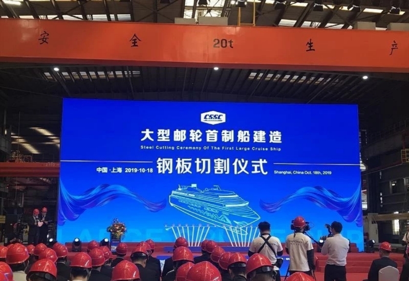 如果說效果圖是品牌還沒確定的產(chǎn)物,2019年10月18日上午10時(shí)40分左右,我國(guó)首艘國(guó)產(chǎn)大型郵輪在上海正式開工建設(shè),現(xiàn)場(chǎng)的圖片依然是這樣的: