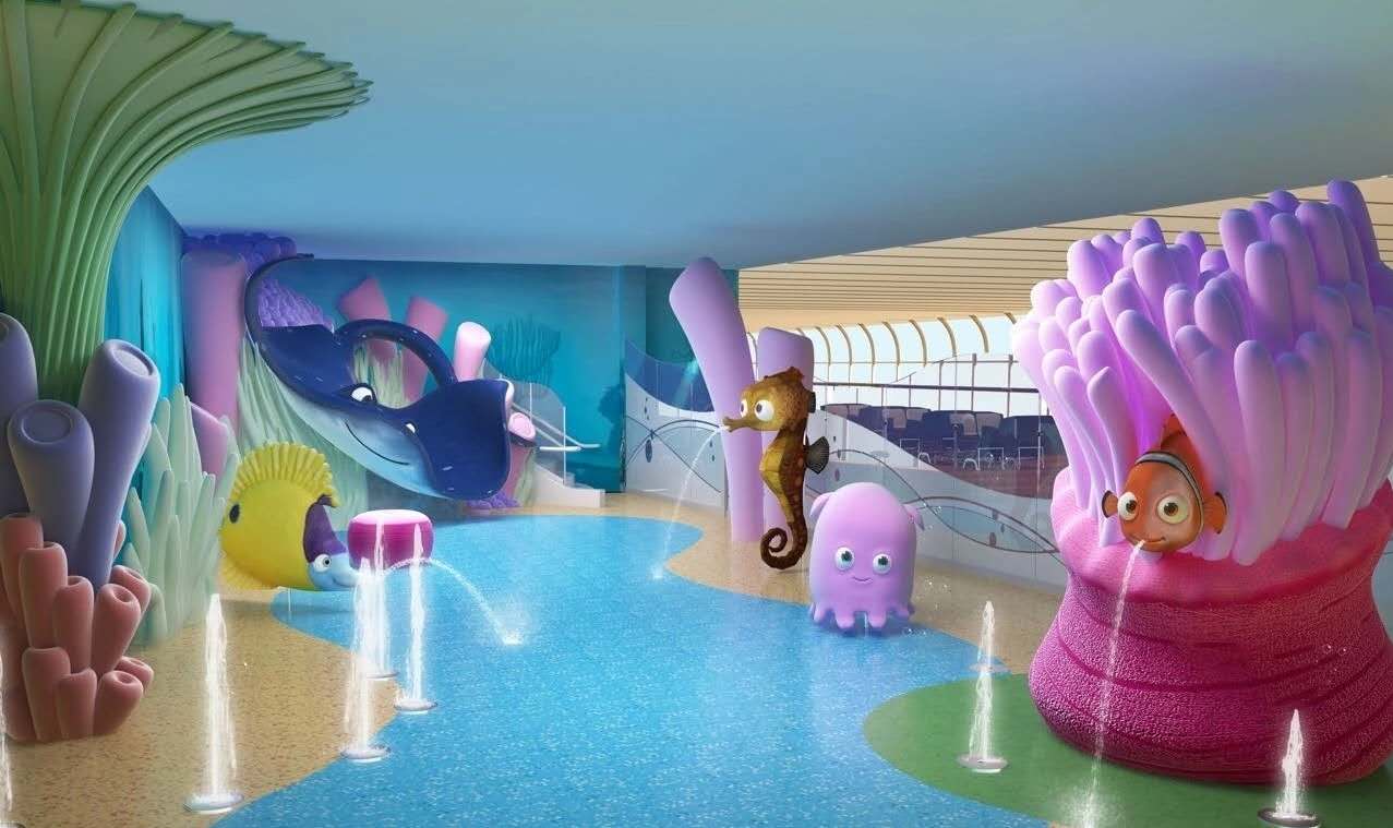 孩子們可以在尼莫(小丑魚)的珊瑚礁海灘上休息一下,這是由玻璃圍墻包圍,1500平方英尺,柔軟的濕甲板表面區(qū)域的完美的海灘,迷你水游戲區(qū),一個(gè)有趣的水上樂園,里面有迪斯尼電影《海底總動(dòng)員》里的水下角色。