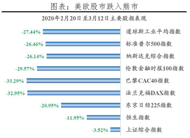 近期美歐主要股市跌幅均超過20%,跌入技術(shù)性熊市,美股甚至3次熔斷,而A股跌幅較小、相對穩(wěn)健,一方面反應(yīng)了中國在抗擊疫情和恢復(fù)生產(chǎn)方面的積極進展,另一方面也反應(yīng)了投資者對歐美疫情蔓延更嚴重更久、陷入經(jīng)濟衰退、引爆金融危機等的擔心。而事實上投資者已經(jīng)在往流動性危機、金融危機的方向進行恐慌性交易,風險資產(chǎn)暴跌,資金躲進避險資產(chǎn),甚至搶流動性。