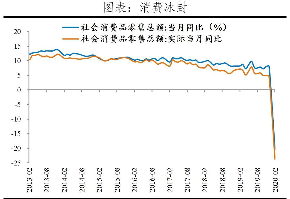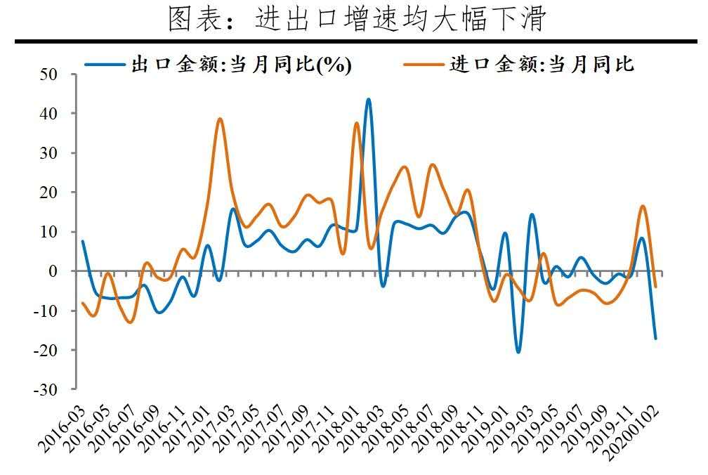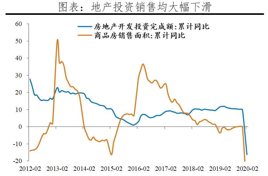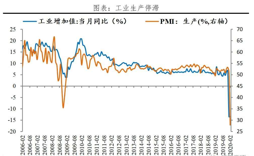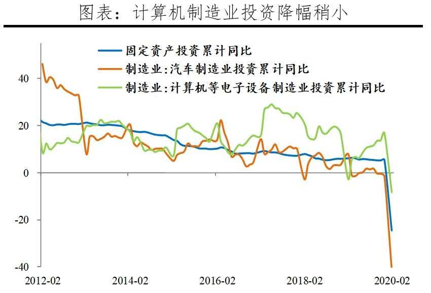 41個大類行業(yè)中僅油氣開采和煙草2個行業(yè)增加值同比正增長,612種產(chǎn)品中僅79種產(chǎn)品同比增長,部分高技術(shù)產(chǎn)品保持較快增長。而在去年12月,41個行業(yè)中有33個正增長,605種產(chǎn)品有365種正增長。1)1-2月汽車工業(yè)重回負增長,同比-31.8%,較12月大幅下滑42.2個百分點。分車型產(chǎn)量看,SUV、轎車和新能源車產(chǎn)量同比分別為-41.3%、-49.8%和-62.8%。2)出口相關(guān)產(chǎn)業(yè)電氣機械、金屬制品、通用設(shè)備、專用設(shè)備、橡膠塑料和紡織工業(yè)增加值同比分別為-24.7%、-26.9%、-28.2%、-24.4%、-25.2%和-27.2%,分別下滑37.1、33.2、33.1、30.9、28.9和27.4個百分點。3)鋼鐵有色等連續(xù)生產(chǎn)型行業(yè)降幅稍小。有色和黑色金屬冶煉同比分別為-8.5%和-2%,分別下滑13.5和12.7個百分點。4)疫情提振醫(yī)療防護和生活物資需求,口罩、發(fā)酵酒精產(chǎn)量同比分別為127.5%和15.6%,凍肉和方便面同比分別為13.5%和11.4%。5)部分高技術(shù)產(chǎn)品智能手表、智能手環(huán)、半導體分立器件和集成電路產(chǎn)量同比分別為119.7%、45.1%、31.4%和8.5%。分地區(qū)看,東部、中部、西部和東北地區(qū)同比分別為-16.9%、-16.7%、-7.6%和-11.5%,分別較12月下降23.8、23.4、15.4和20.5個百分點。