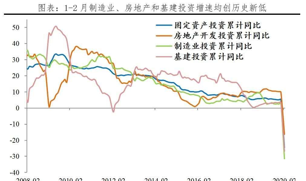 1-2月制造業(yè)投資累計同比-31.5%,較去年12月當月同比下滑40.7個百分點,創(chuàng)歷史新低。分行業(yè)看,中游裝備加工類行業(yè)和下游消費品類行業(yè)是主要拖累,農(nóng)副食品(1-2月累計同比-38.9%)、食品(-35.1%)、紡織(-44.0%)、金屬(-38.1%)、通用設(shè)備(-40.1%)、汽車(-41.0%)等行業(yè)投資下滑幅度大于制造業(yè)投資整體。高技術(shù)產(chǎn)業(yè)投資同比-17.9%,降幅低于整體6.6個百分點,其中高技術(shù)制造業(yè)、高技術(shù)服務(wù)業(yè)投資分別為-16.5%、-20.8%。