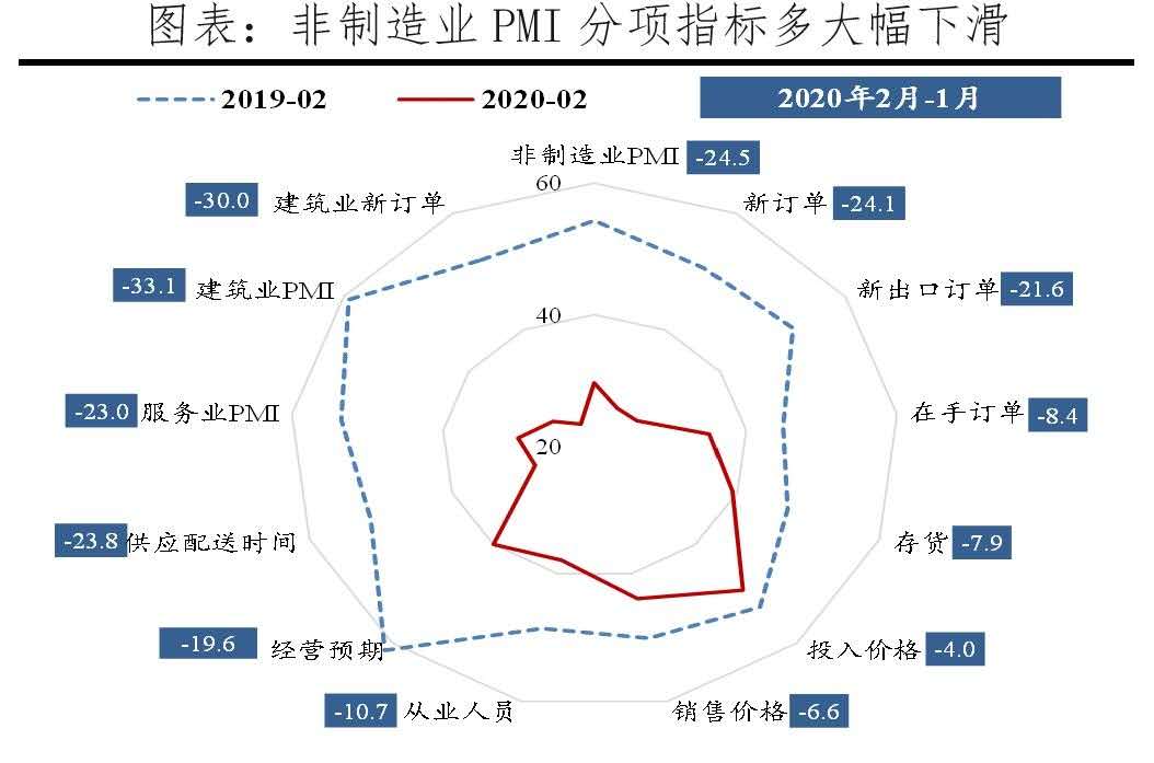 2月非制造業(yè)商務(wù)活動指數(shù)大幅下滑24.5個百分點至29.6%,遠低于2008年金融危機的50.8%。1)服務(wù)業(yè)整體受沖擊更嚴重,服務(wù)業(yè)商務(wù)活動指數(shù)為30.1%,比上月下滑23.0個百分點,21個行業(yè)中19個收縮,交通、餐飲、旅游受損大,在線辦公和娛樂受益。2)建筑業(yè)活動大降,但預(yù)期相對較好,市場對復(fù)工和基建期望高。建筑業(yè)商務(wù)活動指數(shù)和新訂單指數(shù)分別為26.6%和23.8%,較上月下降33.1和30.0個百分點。土木工程建筑業(yè)業(yè)務(wù)活動預(yù)期指數(shù)為51.8%,保持在臨界點以上。