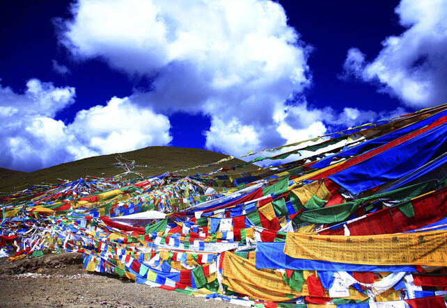在藏區(qū),常??梢钥吹綉覓斓奈宀实慕?jīng)幡。這些方形、角形、條形的小旗被有秩序地固定在門首、繩索、族幢、樹枝上,在大地與蒼穹之間飄蕩搖曳,構(gòu)成了一種連地接天的境界。 成串成串拉掛在亭子和松樹間的彩旗,印滿密密麻麻的藏文咒語(yǔ)、經(jīng)文、佛像、吉祥物圖形。它們就是風(fēng)靡藏區(qū)的“風(fēng)馬旗”。藏民族認(rèn)為雪域藏地的崇山峻嶺、大江莽原的守護(hù)神是天上的贊神和地上的年神,他們經(jīng)常騎著風(fēng)馬在雪山、森林、草原、峽谷中巡視,保護(hù)雪域部落的安寧祥和,抵御魔怪和邪惡的入侵。