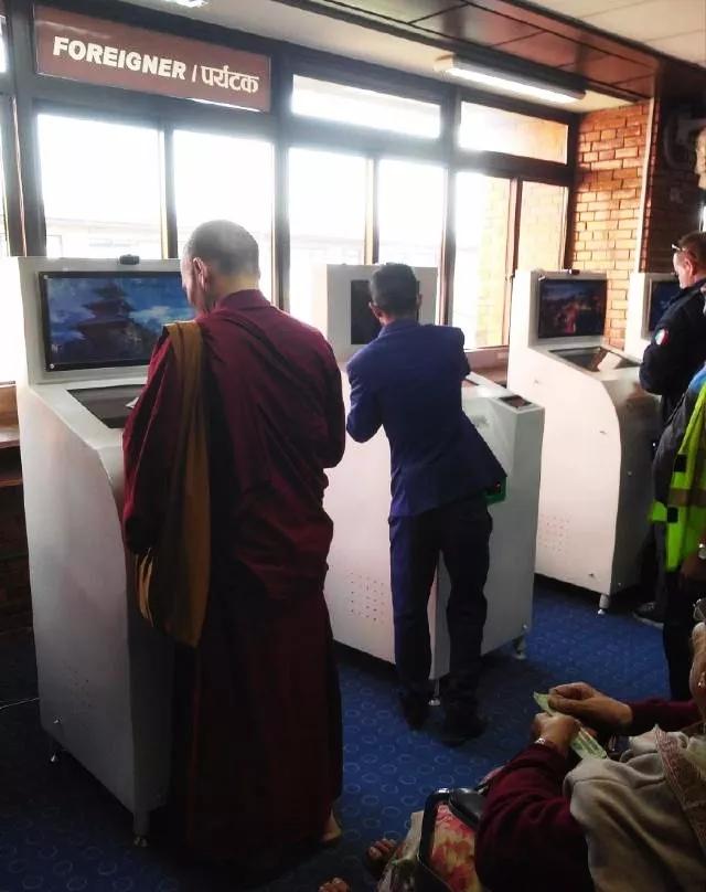 在“VISA APPLICATION”的指引牌的引導(dǎo)下,你就會發(fā)現(xiàn)很多臺下圖的申請落地簽的電子設(shè)備,正常的機器屏幕上會顯示“Welcome to the Department of Immigration,Nepal",根據(jù)屏幕指示點擊進入到下一個環(huán)節(jié)!
