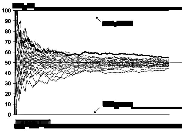 還是以擲硬幣為例,當(dāng)投擲次數(shù)足夠大時,出現(xiàn)正(反)面的頻率將逐漸接近于1/2,且隨著投擲次數(shù)的增加,偏差會越來越小,如下圖。這是最早發(fā)現(xiàn)的大數(shù)定律之一。