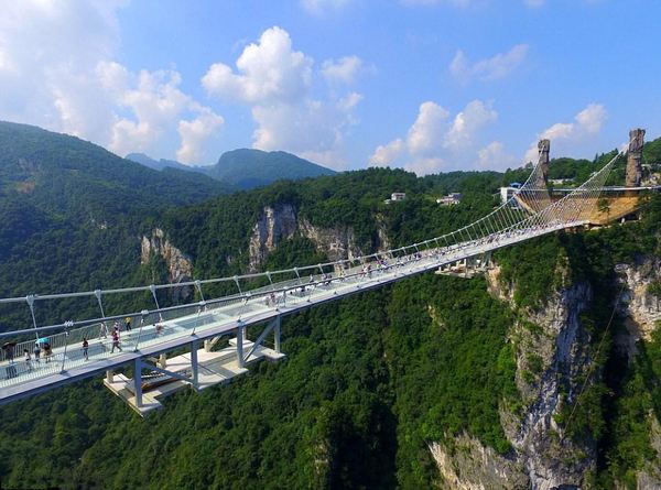 位于張家界大峽谷景區(qū),是世界最高、跨度最長(zhǎng)的玻璃橋,大橋建在大峽谷兩側(cè)的峰頂上,橫跨大峽谷。橋拱距谷底相對(duì)高度約400米,全長(zhǎng)約370米,橋面全部采用透明玻璃鋪設(shè),橋中心有全球最高的蹦極。18年,在國(guó)際橋梁大會(huì)上斬獲阿瑟·海登獎(jiǎng),成為湖南第一個(gè)獲得國(guó)際最高獎(jiǎng)項(xiàng)的橋梁工程項(xiàng)目。