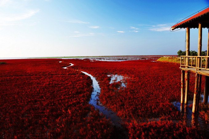 紅海灘位于遼寧省盤錦市渤海灣的東北部,地處遼河三角洲濕地內(nèi),是國(guó)家級(jí)自然保護(hù)區(qū)。這里的海灘之所以呈現(xiàn)出紅色,其實(shí)是因?yàn)楹┥仙L(zhǎng)堿蓬草是一種可以在鹽堿土質(zhì)上存活的草。每年四月,堿蓬草長(zhǎng)出地面,初為嫩紅,漸次轉(zhuǎn)深,秋季由紅變紫。堿蓬草不要撒種,無須耕耘,在鹽堿鹵漬里,年復(fù)一年地生長(zhǎng),造就了這一奇觀。盤錦的紅海灘每年以50米的速度向大海延伸,始終追趕著海浪的蹤跡。
