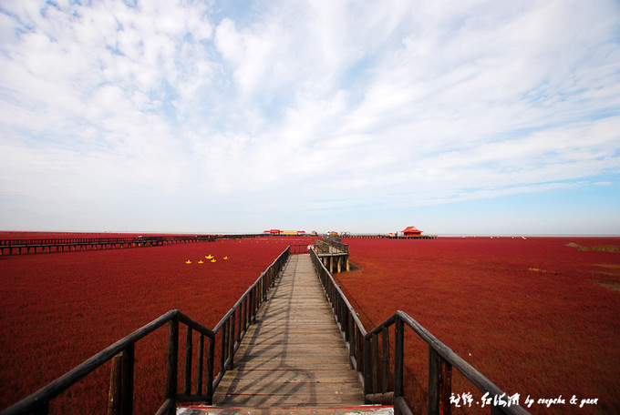 看紅海灘最好的時(shí)候是早晨,幸運(yùn)的話趕上晴天,潮水退際,鮮紅的赤堿蓬開始一點(diǎn)點(diǎn)從水里露出來,恰如紅色地毯逐漸展看,分外妖艷,返種勱態(tài)的感覺不是一般時(shí)機(jī)能享受到的。若是晚一點(diǎn),一是看不到紅顏漸露的過程,再就是泥水干了紅草看上去灰蒙蒙的,沒有潮水剛退去時(shí)那么鮮艷奪目。