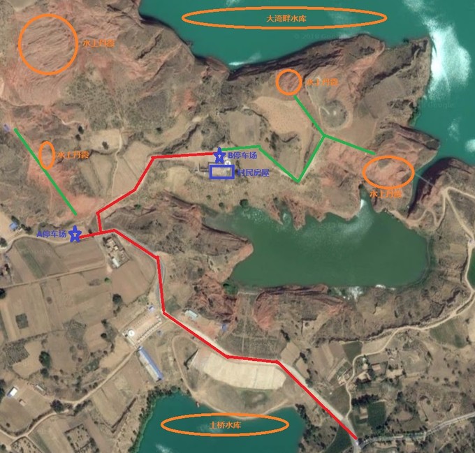在龍州鎮(zhèn)北邊有幾處明顯的“水上丹霞”指示牌指向水上丹霞,過土橋水庫向前幾百米,A停車場就在路邊,停車前行就可以看見被圍欄圍起來的一片丹霞。B停車場設(shè)在當?shù)匾粦艮r(nóng)民的院內(nèi),右手有一個農(nóng)民自己修建的岔路,進去一兩百米就是了。