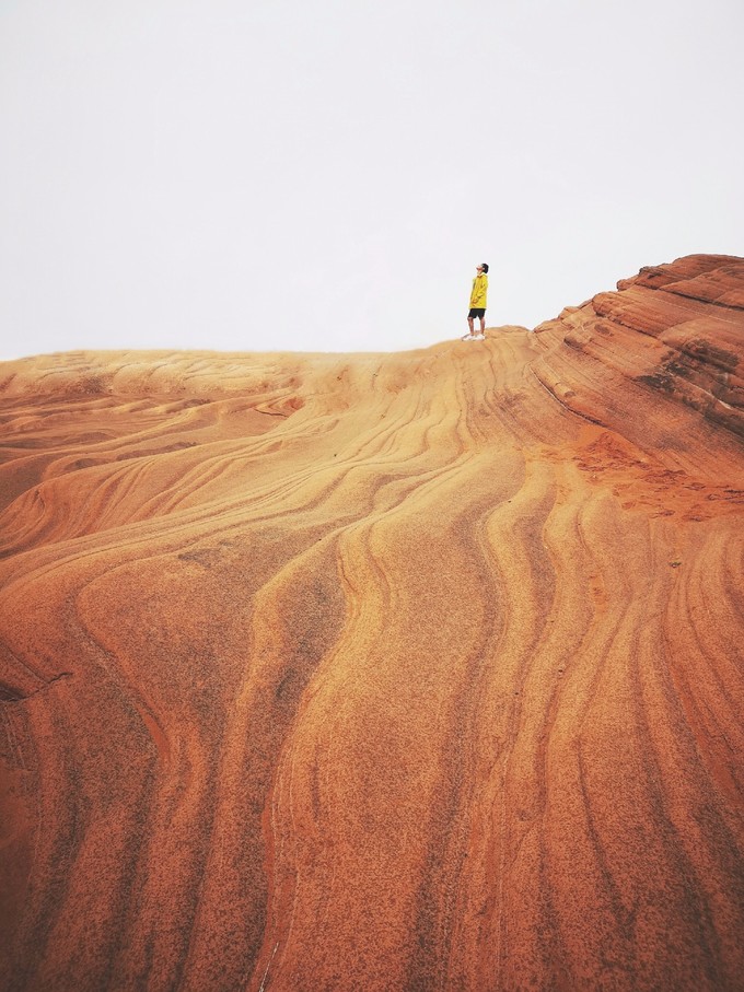 波浪谷狀的丹霞地貌,是由一億五千萬年前侏羅紀時期沉積的巨大的沙丘所組成,沙丘不斷地被一層層浸漬了地下水的紅巖所覆蓋,天長地久,水中的礦物質(zhì)把沙凝結(jié)成了砂巖,形成了層疊狀的結(jié)構(gòu),所以被譽為“時光的指紋”。讓我們一起走進這紅色魔幻世界。