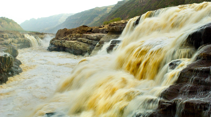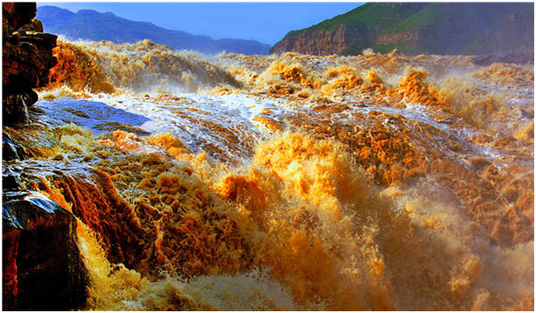 滔滔黃河,自青海源頭東流經(jīng)甘肅、寧夏,在內(nèi)蒙古河口鎮(zhèn)受呂梁山脈阻擋,轉(zhuǎn)南進(jìn)入秦晉峽谷。黃河流域到此似乎厭倦了一路的平緩,突然斂水成束,一頭扎進(jìn)這40米深的形似壺口的石槽中,剎那時(shí)這洶涌的急流,怒吼的洪波撞開了一幕千古奇觀。這水,勢(shì)如排山倒海,驚天動(dòng)地;疾如萬馬奔騰。頃刻間,猶如天河從天而來。