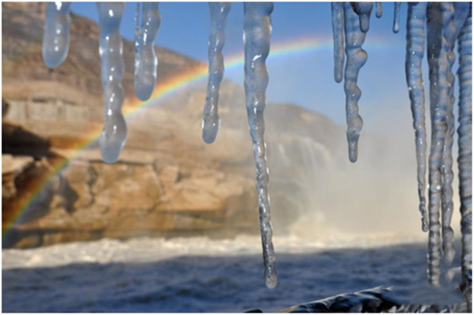 寒冬,冰封河面,瀑布失去了往日的狂奔怒號(hào)的野馬性格,變成了一座冰清玉潔的水晶宮,岸崖上,掛滿了長短不齊,粗細(xì)各異的冰凌,晶瑩剔透,玲瓏奇巧。在陽光的照射下,反著銀光。