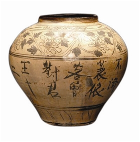 磁州窯還大量題寫詩(shī)文做器物的裝飾,這種裝飾風(fēng)格最初始于唐代長(zhǎng)沙窯,而磁州窯得到進(jìn)一步的發(fā)展和完善,其書寫方法無(wú)一定規(guī)格,非常隨意。