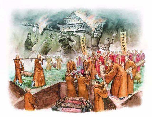 然而,僧尼還俗還不足以泄皇帝心中對佛教之惡,他們甚至向僧眾們舉起了屠刀。魏太武帝的措施是最為殘暴的,他采用“沙門無少長,悉坑之” 的方法來打擊佛教徒。幸運的是虔信佛教的太子拓跋晃時為留守平城的監(jiān)國,他利用秉政之機,有意緩宣太武帝的滅佛詔書,使遠近各地的僧侶得到消息后亡匿免死。但這只能是平城地區(qū)僧侶的幸運,其他地區(qū)的僧侶卻在劫難逃。《南齊書》卷五十七《魏虜傳》記載:“初,佛貍討羯胡于長安,殺道人且盡。”《高僧傳》卷十《曇始傳》也載:“以偽太平七年,遂毀滅佛法,分遣軍兵,燒掠寺舍,統(tǒng)內僧尼悉令罷道,其有竄逸者,皆遣人追捕,得必梟斬。一境之內,無復沙門?!北蔽禾涞凵踔吝B為僧尼提供避難之所的俗人也不放過。據(jù)《魏書·世祖紀》稱:“自王公以下至于庶人,有私養(yǎng)沙門……在其家者,皆遣詣官曹,不得容匿。限今年二月十五日,過期不出,師巫、沙門身死,主人門誅。”唐武宗也下令,如有僧尼不伏還俗者,科違敕罪,當時決殺。會昌三年(843年)四月中旬,武宗令殺天下摹尼師,將剃發(fā)及著袈裟作沙門形殺之。由此可見,措施是嚴厲的,手段是殘暴的。但太武帝卻以滅佛是“除偽定真,復羲農之治”,乃“有非常之人,然后能行非常之事” 而津津樂道。