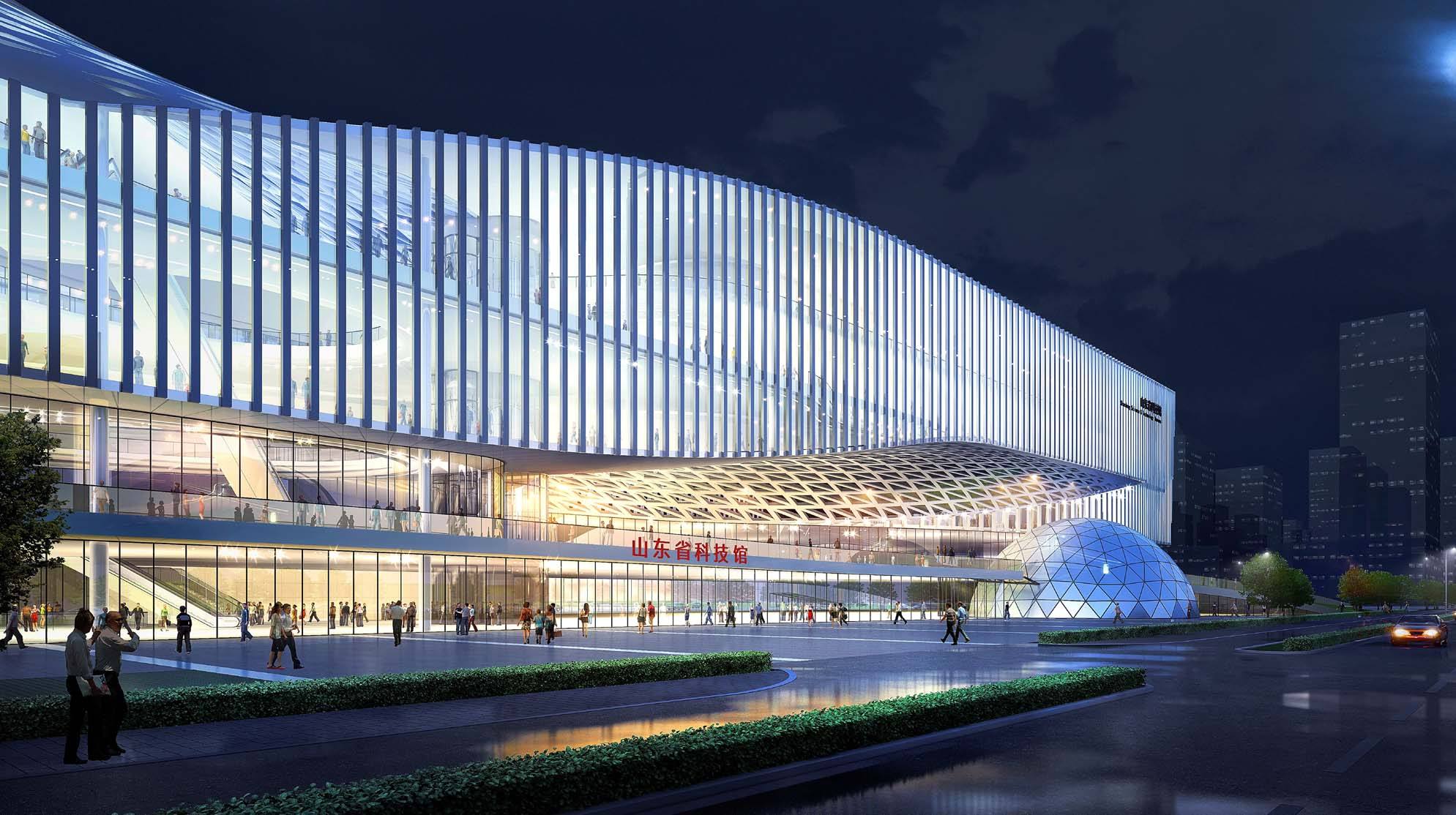 山東省科技館位于泉城廣場(chǎng)最東側(cè),是在原濟(jì)南劇院和美術(shù)總廠已有建筑的基礎(chǔ)上擴(kuò)建而成的。最高位五層,新建部分高度達(dá)22.95米,擴(kuò)建后的總面積近2萬平方米。一直四層為各類別的展廳,四層頂面上設(shè)有天象儀和大型電子屏幕。山東省科技館是一座普及科普教育、進(jìn)行科技宣傳的大型現(xiàn)代化科技展館。