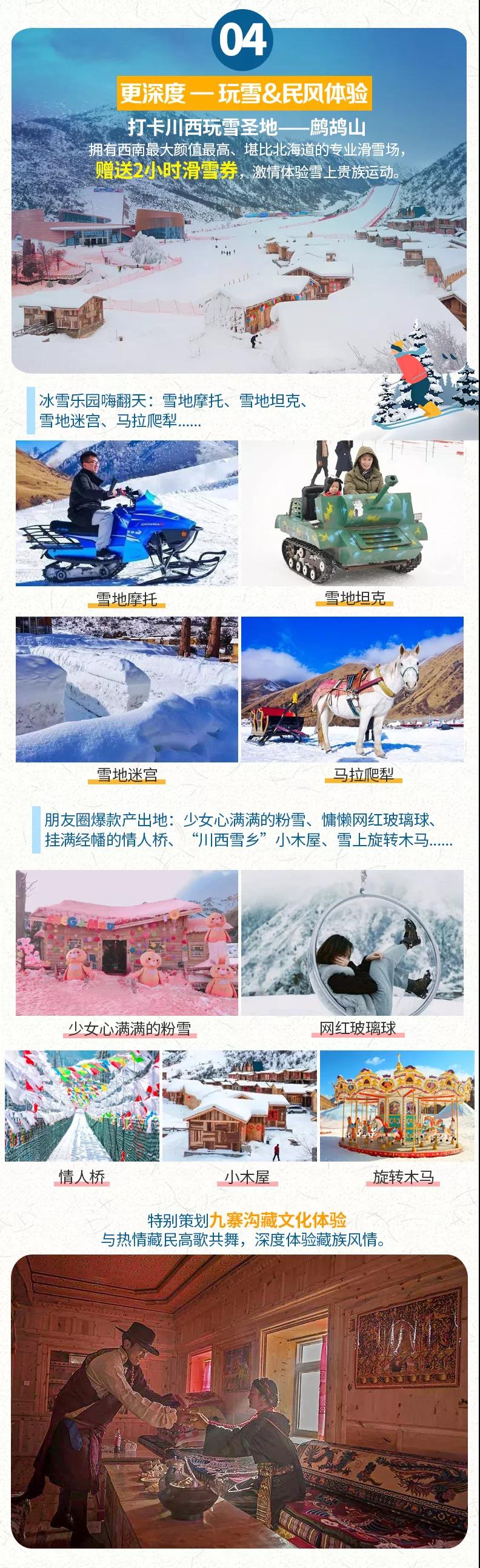 吃過精美的酒店自助早餐后我們開始我們的錯峰九寨滑雪之旅,途經(jīng)汶川,最后抵達(dá)【鷓鴣山自然公園】。我們在景區(qū)門口換乘觀光車前往冰雪世界樂園景區(qū)。鷓鴣山自然公園山高谷深,風(fēng)景秀麗,擁有優(yōu)越的高山及森林資源,尤其是于冬季劃分的滑雪場、戲雪場2個獨立區(qū)域,多種游玩趣味和游玩方式更是吸引了成千上萬的“賞雪”“玩雪”愛好者前來,各式各樣高達(dá)18種的玩雪項目(自費項目具體可參考費用不含部分)能滿足大部分玩家的需求。在這里我們安排了2小時的雪上貴族運動——滑雪體驗,在專業(yè)滑道上來一次刺激的“雪上俯沖”,菜鳥級別的你在滑雪時,可能會與大地進(jìn)行多次親密接觸,不過不摔兩跤又怎么能學(xué)會滑雪呢?