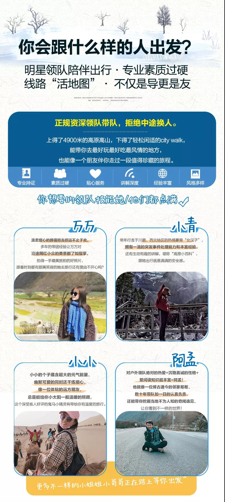 3、九寨溝面積較大游客需求不一,因此主要以游客自助游形式游覽,如無導(dǎo)游陪同望您諒解。游覽開始前導(dǎo)游會與您約定好集合時間,請務(wù)必按時到達(dá)指定地點,避免耽誤大家接下來的行程;