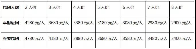 包團(tuán)報價均按2人入住1標(biāo)間核算,如出現(xiàn)單人,平時需另補房差700元/人,春節(jié)需另補房差900元/人。