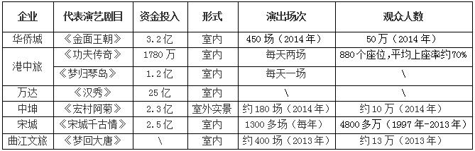 目前,國內(nèi)像萬達(dá)集團(tuán)、華僑城集團(tuán)、港中旅集團(tuán)、曲江文旅、宋城演藝、中坤集團(tuán)等企業(yè)都在其主題景區(qū)中打造了旅游演藝項(xiàng)目,但每一家又選擇了不同的發(fā)展路徑,其各自的生存狀況也不盡相同。