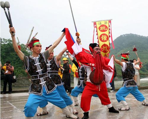 跳鐘馗:一種民間舞蹈,又稱“嬉鐘馗”。據(jù)悉,跳鐘馗,源自北宋,是古徽州遺存下來(lái)的一種傳統(tǒng)民俗表演,有《出巡》、《嫁妹》、《除五毒》等多種內(nèi)容,體現(xiàn)了民眾崇尚鐘馗的剛正不阿和祈盼除害降福的美好愿望。在民間,“鐘馗”是避邪扶正的象征,端午跳鐘馗,寓意為消除五毒,四季平安,人壽年豐。到了清代,江南蘇、浙一帶的居民大都在農(nóng)歷五月于大門或堂中掛鐘馗圖一月,以期驅(qū)邪除害、祛兇引福。