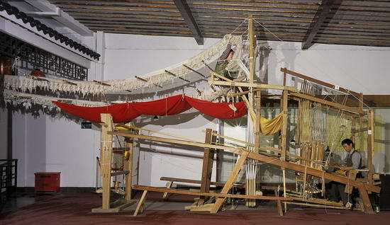 第四道工序是造機(jī),造機(jī)就是根據(jù)所織云錦的品種、規(guī)格,把織造云錦所需的經(jīng)絲,按地部組織、紋部組織的不同要求分辨安裝到位,使其符合織造的需要。