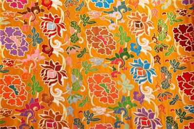 在云錦的妝花品種中,還有一種叫做“金寶地”的織物。這是中國(guó)傳統(tǒng)絲織品中特有的品種。“金寶地”是用圓金線(即捻金線)織滿地,在金地上織出五彩繽紛、金彩交輝的花紋,織品極為富麗堂皇。