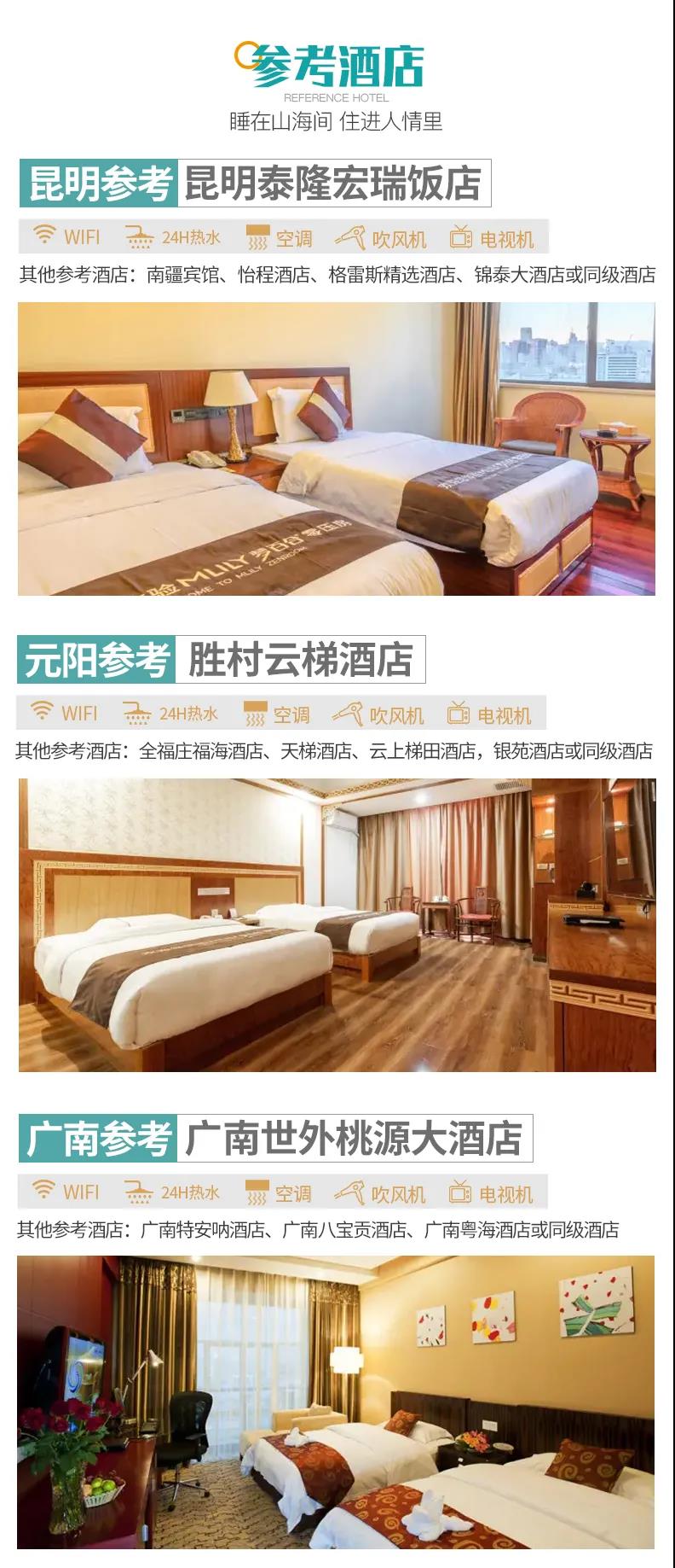 住宿 :行程所列7晚當(dāng)?shù)鼐频陿?biāo)間,并贈(zèng)送集合日昆明四星酒店一晚。元陽景區(qū)酒店標(biāo)間2晚、廣南準(zhǔn)四酒店1晚、彌勒準(zhǔn)四星酒店標(biāo)間1晚、羅平縣三星酒店1晚、普者黑景區(qū)精品客?;蚓频?晚(景區(qū)內(nèi)住宿均為攝影農(nóng)家客棧標(biāo)準(zhǔn)間,不帶星級(jí);因沿途條件有限,如酒店設(shè)施達(dá)不到您的期望,請(qǐng)您諒解)