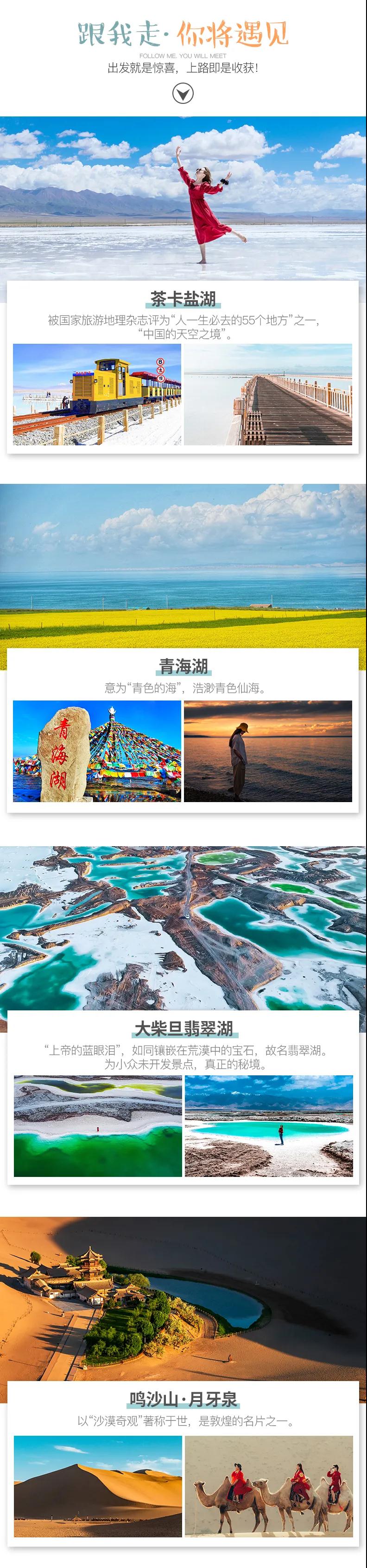 青海湖+茶卡鹽湖+莫高窟+大柴旦翡翠湖+張掖七彩丹霞+鳴沙山月牙泉+嘉峪關(guān)+九層妖塔石油小鎮(zhèn)經(jīng)典絲路