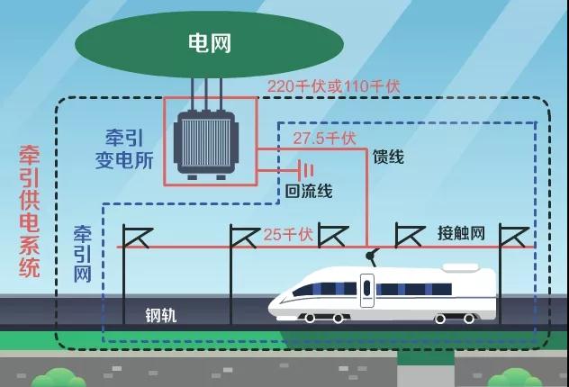 另外,高鐵用電和家庭用電不同。家庭用電的電壓等級一般是220伏,而高鐵用電雖同為單相電壓,但電壓等級卻高達(dá)25(27.5)千伏。這種單相、25(27.5)千伏的交流電是由牽引變電所將電網(wǎng)輸?shù)碾娹D(zhuǎn)變而來。