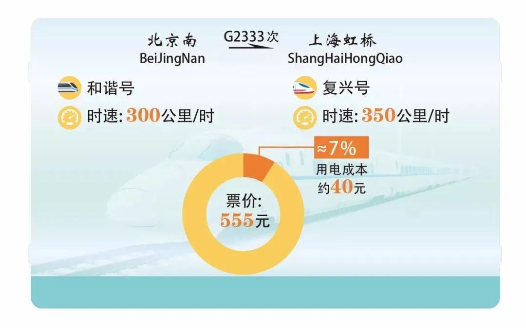 我們來看個實(shí)例。以京滬高鐵為例,據(jù)新華社報(bào)道,和諧號動車組時(shí)速300公里時(shí),人均百公里耗電量為3.64度、單趟全程總耗電量約48度。據(jù)《科技日報(bào)》報(bào)道,時(shí)速350公里運(yùn)行的復(fù)興號動車組人均百公里能耗僅3.8度電,單趟全程總耗電量約50度。按照目前高鐵享受的優(yōu)惠電價(jià)算,用電成本約40元,為京滬高鐵全程二等座票價(jià)555元的7%左右。