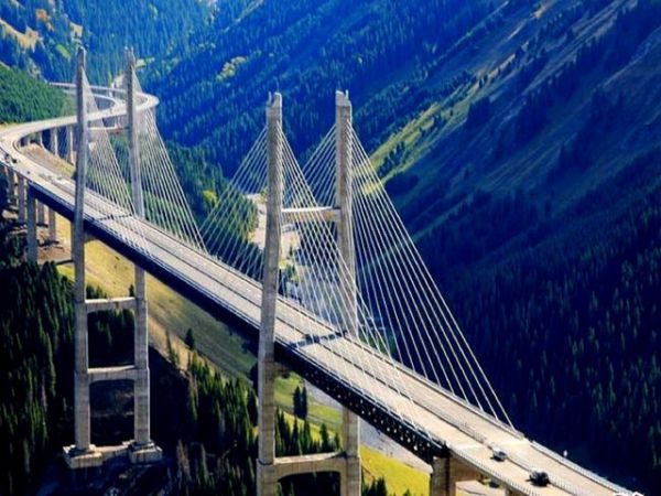 果子溝大橋作為新疆第一座斜拉橋、第一高橋,是新疆最大最重要的橋梁,同時也是全國首座公路鋼桁梁斜拉橋,它集新技術、新結構、新工藝、新設備"四新"于一身,是新疆公路建設史上一次重大突破。在新疆首次使用大體積混凝土溫度控制技術、塔梁異步施工工藝、液壓爬膜、自行式移動模架等國內(nèi)領先技術,為山區(qū)高速公路施工積累了寶貴的經(jīng)驗。