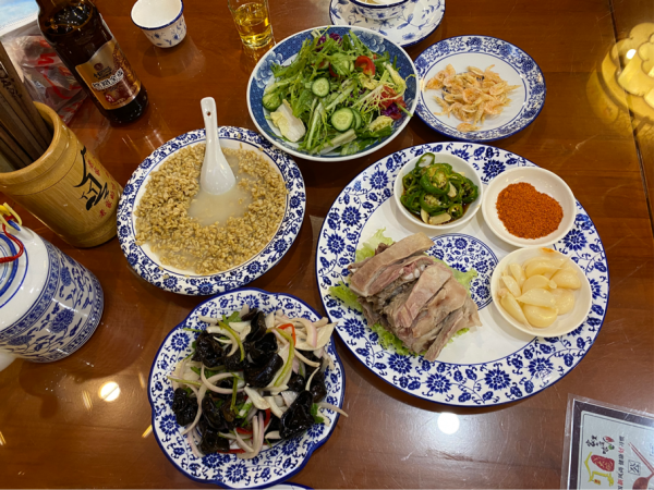 游覽結(jié)束,回到天水市區(qū)入住。想吃當(dāng)?shù)靥厣?,找到了“老家八大碗”解決晚飯,非常滿意,手抓羊肉、甜胚子、大拌菜,有滋有味。此時(shí)還不知道接下來面臨什么樣的美食荒漠。當(dāng)?shù)氐臋烟乙脖容^有名便宜,路上買了一點(diǎn)。