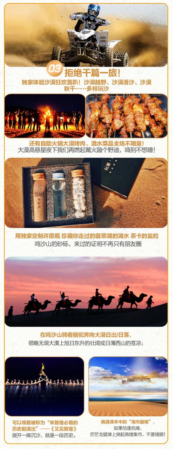 晚上在敦煌來一場絕無僅有的沙漠轟趴盛宴,沙漠越野、沙漠摩托、刺激滑沙、古城打鐵花……花樣玩法,玩累了咱們就坐地品嘗特別贈送的沙漠BBQ,酒水菜品全場不限量,大家圍繞著篝火舞蹈,聞著燒烤的炭火香,暢飲著啤酒,品嘗已然備好的燒烤,在鳴沙山的夜里熱情似火燃燒整個(gè)大漠!