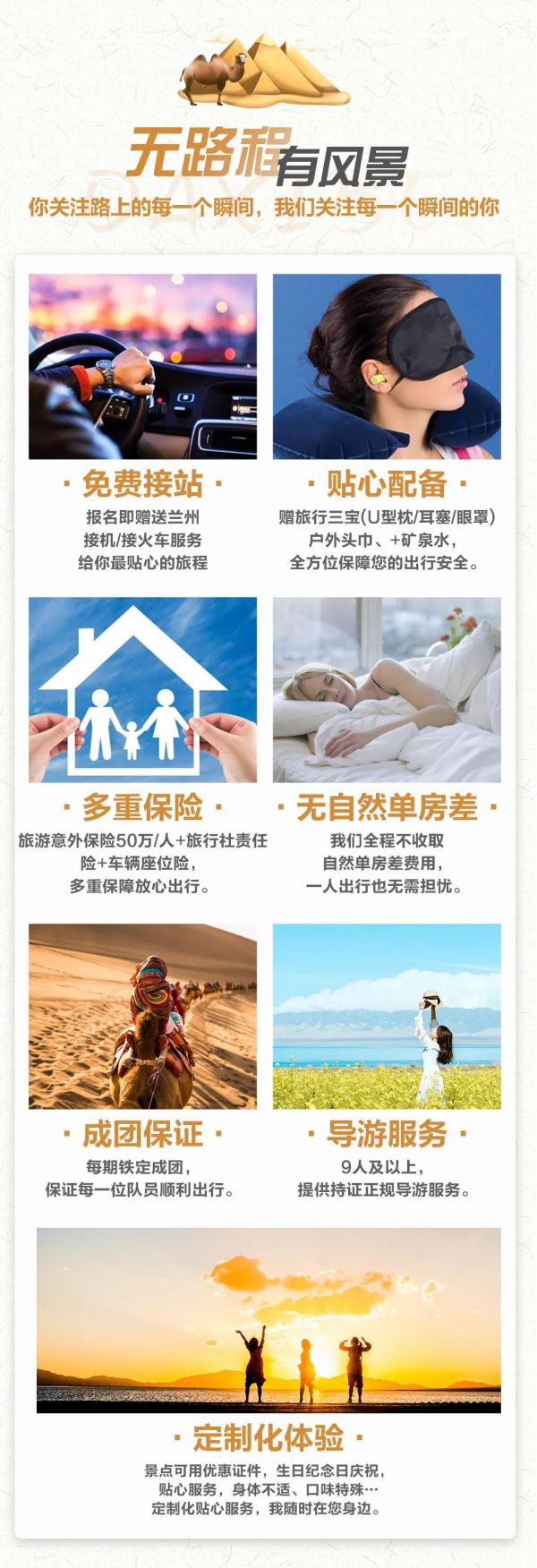 私人訂制:我們業(yè)務(wù)范圍囊括了全國各大城市,川西、西北、東北,在路上永遠(yuǎn)有我們的身影。我們將為每一個(gè)有定制需求的你策劃出獨(dú)屬于自己的完美旅行。