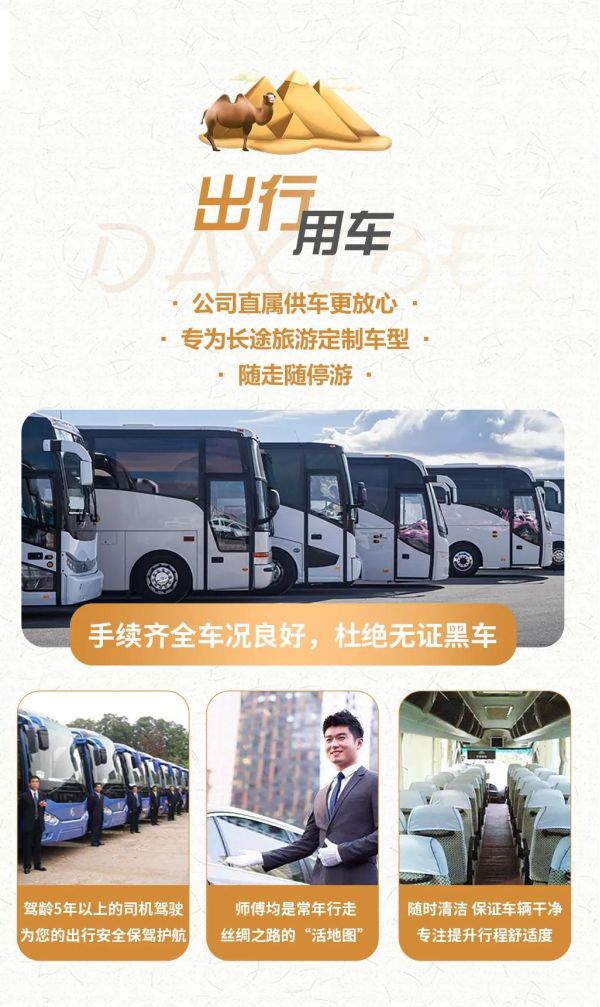 交通:全程正規(guī)空調(diào)旅游車出行,保證一人一正座位,車型大小根據(jù)實(shí)際人數(shù)安排,且由駕駛經(jīng)驗(yàn)豐富的司機(jī)為您的出行保駕護(hù)航,報(bào)價(jià)包含車費(fèi)、油費(fèi)、停車費(fèi)、維修費(fèi)及司機(jī)勞務(wù)費(fèi)。