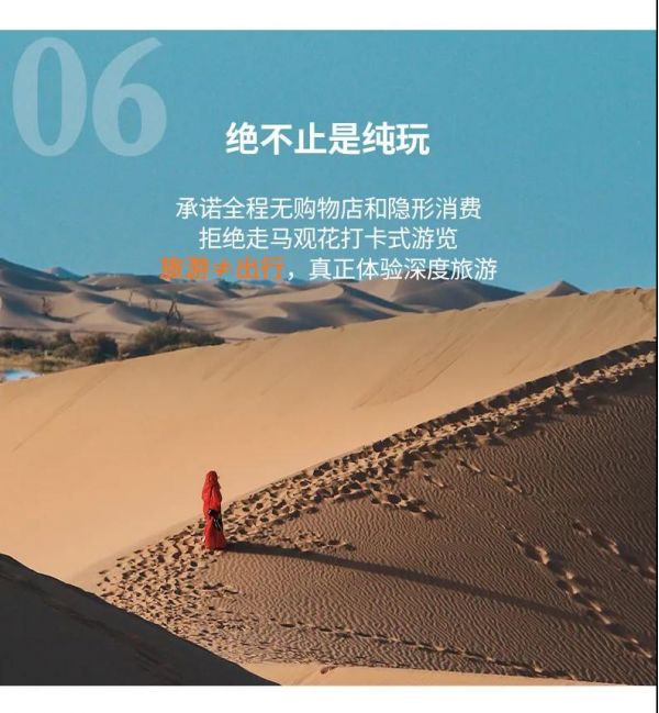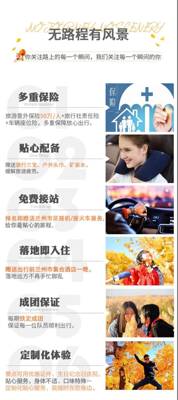 3、贈(zèng)送:貼心禮包戶外百變魔術(shù)頭巾防曬防沙+旅游三寶緩解乘車疲勞+每人每天一瓶礦泉水;贈(zèng)送蘭州市區(qū)接機(jī)/接火車服務(wù)(23點(diǎn)后由于運(yùn)管規(guī)定不能接機(jī)/接站);項(xiàng)目不用不退,望您諒解。