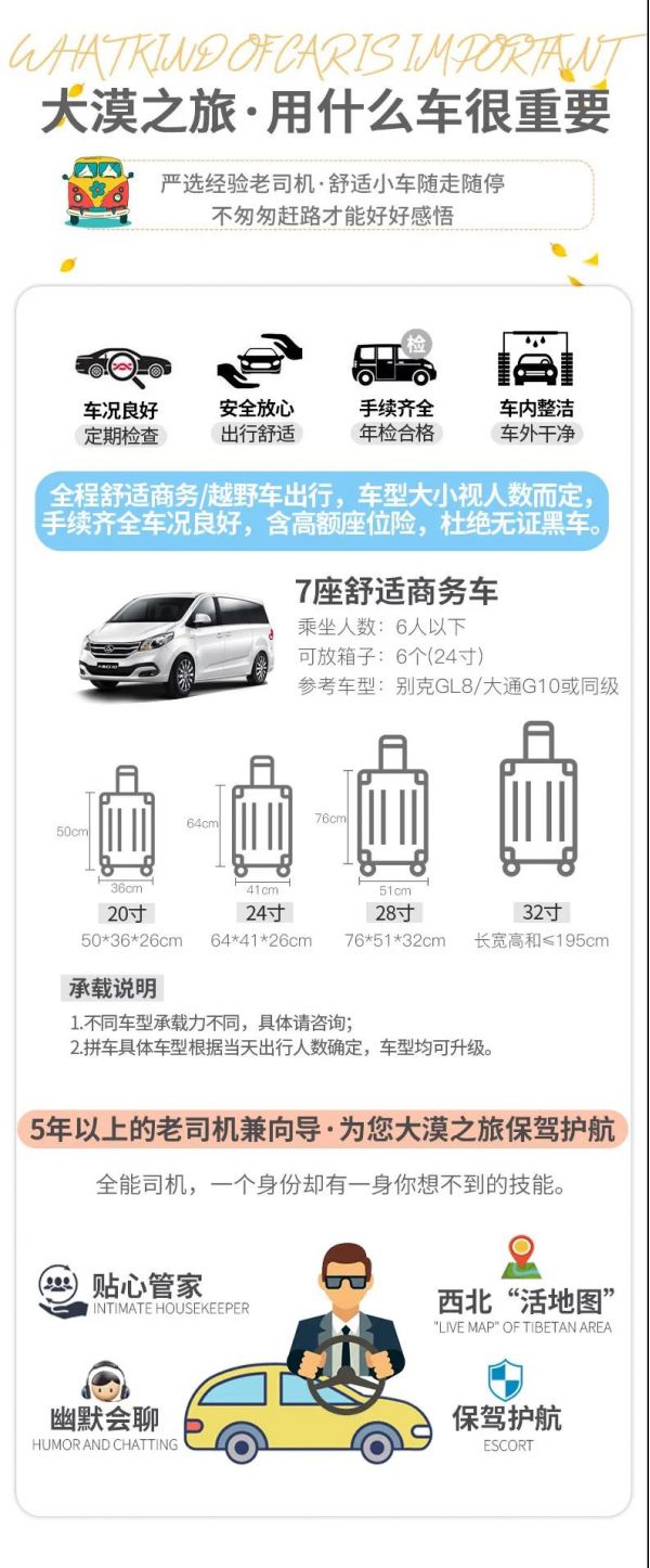 1、交通:2-6人VIP私享小團(tuán),全程舒適商務(wù)車出行,保證一人一正座位,且由駕駛經(jīng)驗(yàn)豐富的司機(jī)為您的出行保駕護(hù)航,報(bào)價(jià)包含車費(fèi)、油費(fèi)、停車費(fèi)、維修費(fèi)及司機(jī)勞務(wù)費(fèi)。
