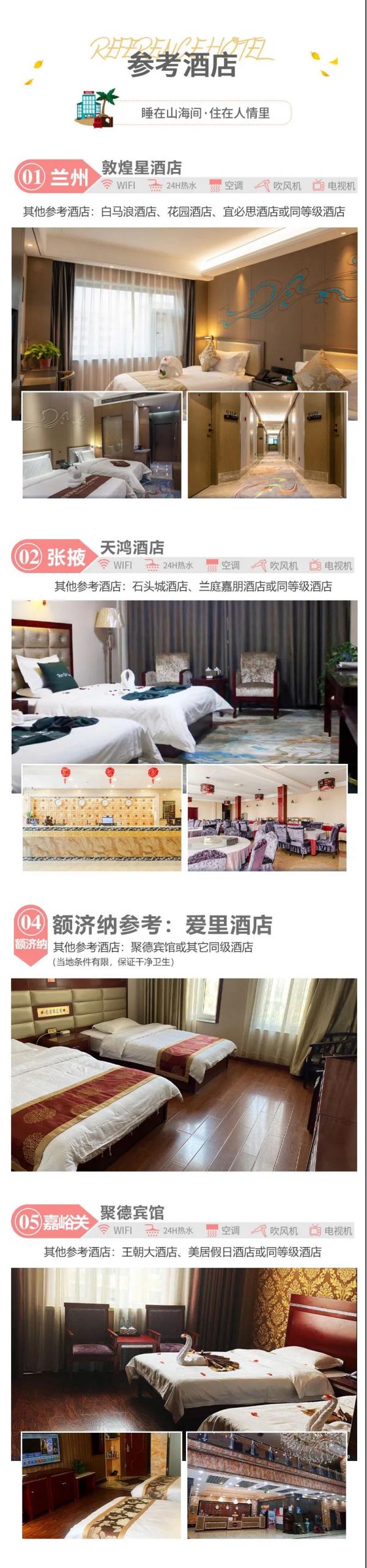 l 蘭州酒店:敦煌星酒店、白馬浪酒店、花園酒店、瀾海溫泉酒店、新勝利賓館、宜必思酒店、星程酒店、河灣麗景酒店或同等級酒店