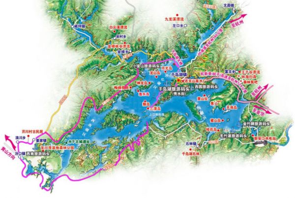 千島湖位于浙江省杭州西郊的淳安縣境內(nèi)(部分位于安徽歙縣),東距杭州129公里,西距黃山130公里,是“杭州——千島湖——黃山”這條名城、名湖、名山黃金旅游線上的一顆璀璨明珠。