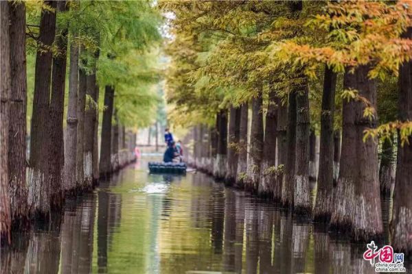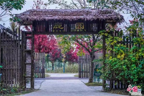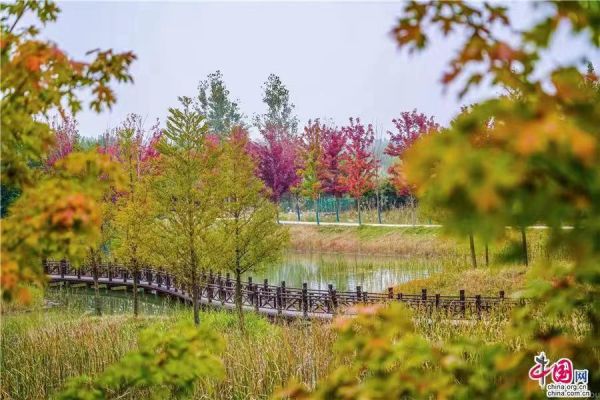 水杉林對(duì)面是鹿園,園門將濕地最濃艷的一抹秋色“鎖住”,園里種植的美國楓葉以及其他彩林樹種,紅黃橙綠五彩點(diǎn)綴亭子與木棧道,雖是沒看見鹿,但收獲了最艷麗的濕地之秋。
