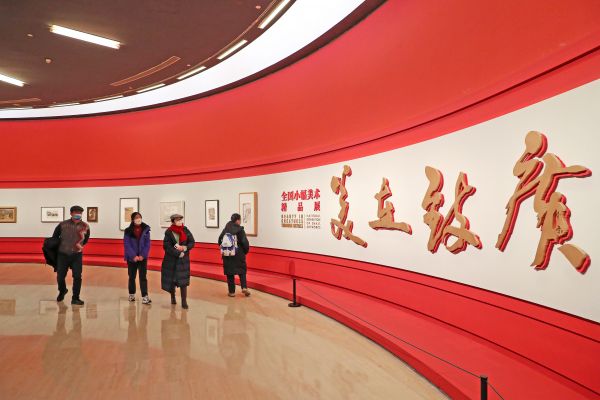 本次展覽的作品中,尺幅最小的僅有郵票大小,最大的也僅半米見方。這其中既有美術(shù)史中的經(jīng)典名作,如齊白石的《咸蛋小蟲》、徐悲鴻的《雙獅》、李樺的《怒吼吧,中國(guó)!》、胡一川的《牛犋變工隊(duì)》等,也有00后藝術(shù)家的最新創(chuàng)作。此次展覽展出了從6500余件投稿中精選出的近600件征集作品,另有中國(guó)美術(shù)館館藏、特邀作品400件,共計(jì)1000件,涵蓋中國(guó)畫、油畫、版畫、雕塑、水彩、工藝等美術(shù)種類,是近年來(lái)中國(guó)美術(shù)館單次展出作品數(shù)量最多的一場(chǎng)。